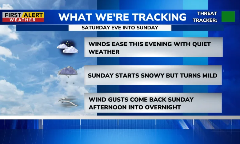 Conditions are expected to calm by Saturday, which will be mainly cloudy with highs near 36 degrees and lighter winds. Forecasters note another First Alert Weather Day is in place for Sunday, when snow will start and transition to freezing rain for a couple of hours during the late morning, followed by increasing rain Sunday night into Monday as temperatures warm, then a return to snow showers during Monday daytime hours.