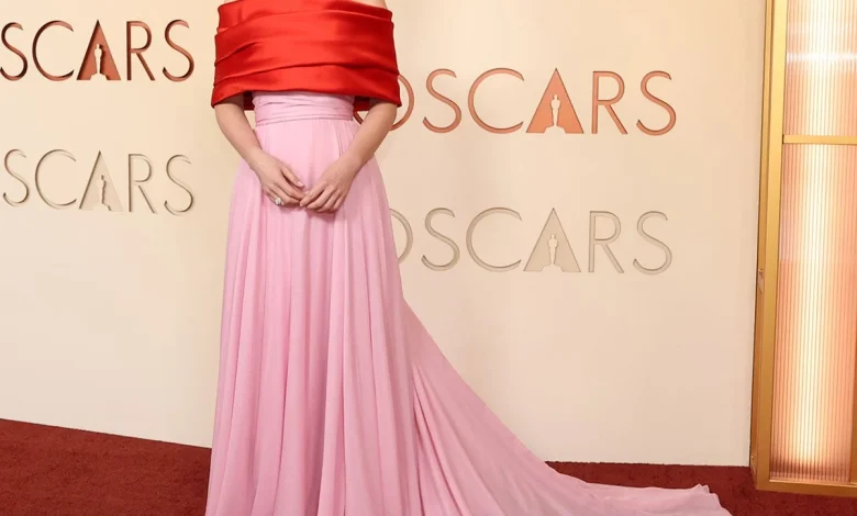 The refined silhouette and feathered detailing placed the Oscar winner among the evening’s standout fashion moments, with the soft palette and craftsmanship-forward details amplifying her return to the ceremony’s red carpet.
